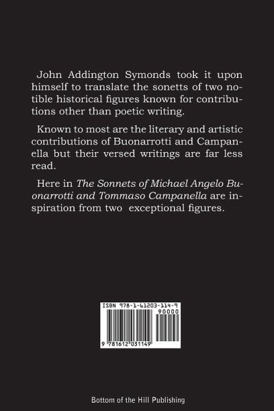 John Addington Symonds took it upon himself to translate the sonetts of two notible historical figures known for contributions other than poetic writing. Known to most are the literary and artistic contributions of Buonarotti and Campanella but their versed writings are far less read. Here in The Sonnets of Michael Angelo Buonarotti and Tommaso Campanella are inspiration from two exceptional figures.