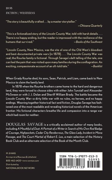 THE DEAD MAN’S JOURNEY—Journada del Muerte, the locals called it: the blistering ocean of sand and sage between the Rio Grande River to the west and the Sacramento mountain range to the east. The bones of men and horses had bleached in the mile-high desert for three hundred years. Spanish conquistadors were the first white men to explore this new furnace of the Southeastern New Mexico Territory—and the first to perish. In the thin air, the riders coming down the mountain were sharply etched against the blue sky. Steam, blowing out of the ice-encrusted nostrils of their mounts and their two pack horses, surrounded the horsemen in a white veil. Descending the eastern face of the Sacramento mountains, the horses walked slowly and painfully on cracked hooves. The icy earth offered only a steep path paved with shards of glass; blood seeped around well-worn iron horseshoes. When the riders looked to the sky, they saw that the white sun would stay high enough for them to make Fort Stanton, ten miles into the valley. The riders knew the trail since boyhood. Words were not wasted in country where a man’s mouth would crack and bleed like his horse’s hooves. Beyond the fort lay the clapboard settlement of Lincoln. When Grady Rourke died, his sons, Sean, Patrick, and Liam, came back to claim the family land . . . What was left of it. It was January, 1878, when the Rourke brothers came back to this hard and dangerous land. They thought they were coming home. What they didn’t know was that they were about to become part of a vicious struggle for power. And that they would be forced to choose sides with either John Tunstall and Alexander McSween or J. J. Dolan and Sheriff William Brady. The battle would quickly become the infamous Lincoln County War—a dirty little war with no rules, no heroes, and no happy endings. Douglas Savage, the acclaimed author of Cedar City Rendezvous and Highpockets has taken the historical facts surrounding the Lincoln County War and its fascinating characters, and fashioned one of the most readable and revealing tales of the American frontier.