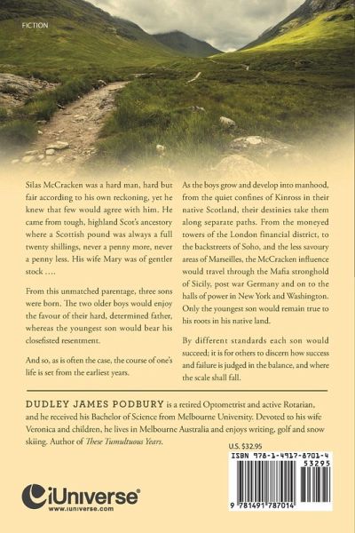 Silas McCracken was a hard man, hard but fair according to his own reckoning, yet he knew that few would agree with him. He came from tough, highland Scot's ancestory where a Scottish pound was always a full twenty shillings, never a penny more, never a penny less. His wife Mary was of gentler stock .... From this unmatched parentage, three sons were born. The two older boys would enjoy the favour of their hard, determined father, whereas the youngest son would bear his closefisted resentment. And so, as is often the case, the course of one's life is set from the earliest years. As the boys grow and develop into manhood, from the quiet confines of Kinross in their native Scotland, their destinies take them along separate paths. From the moneyed towers of the London financial district, to the backstreets of Soho, and the less savoury areas of Marseilles, the McCracken influence would travel through the Mafia stronghold of Sicily, post war Germany and on to the halls of power in New York and Washington. Only the youngest son would remain true to his roots in his native land. By different standards each son would succeed; it is for others to discern how success and failure is judged in the balance, and where the scale shall fall.