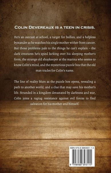 Colin Devereaux is a teen in crisis. He's an outcast at school, a target for bullies, and a helpless bystander as he watches his single mother wither from cancer. But those problems pale to the things he can't explain - the dark creatures he's spied lurking over his sleeping mother's form, the strange old shopkeeper at the marina who seems to know Colin's mind, and the mysterious puzzle box that the old man trades for Colin's name. The line of reality blurs as the puzzle box opens, revealing a path to another world and a clue that may save his mother's life. Stranded in a kingdom devastated by darkness and war, Colin joins a ragtag resistance against evil forces to find salvation for his mother and himself.