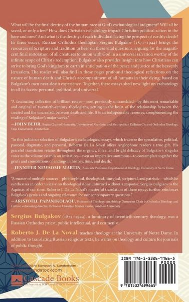 What will be the final destiny of the human race at God's eschatological judgment? Will all be saved, or only a few? How does Christian eschatology impact Christian political action in the here and now? And what is the destiny of each individual facing the prospect of earthly death? In these essays, Russian Orthodox theologian Sergius Bulgakov (1871-1944) brings the resources of Scripture and tradition to bear on these vital questions, arguing for the magnificent final restoration of all creatures to union with God in a universal salvation worthy of the infinite scope of Christ's redemption. Bulgakov also provides insight into how Christians can strive to bring God's kingdom to earth in anticipation of the peace and justice of the heavenly Jerusalem. The reader will also find in these pages profound theological reflections on the nature of human death and Christ's accompaniment of all humans in their dying, based on Bulgakov's own near-death experience. Together, these essays shed new light on eschatology in all its facets: personal, political, and universal.