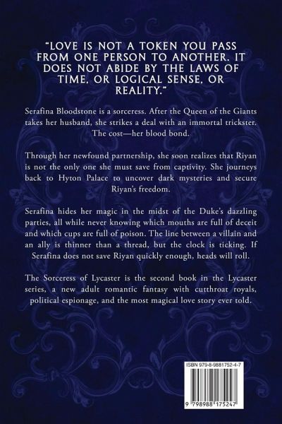 "Love is not a token you pass from one person to another. It does not abide by the laws of time, or logical sense, or reality." Serafina Bloodstone is a sorceress. After the Queen of the Giants takes her husband, she strikes a deal with an immortal trickster. The cost-her blood bond. Through her newfound partnership, she soon realizes that Riyan is not the only one she must save from captivity. She journeys back to Hyton Palace to uncover dark mysteries and secure Riyan's freedom. Serafina hides her magic in the midst of the Duke's dazzling parties, all while never knowing which mouths are full of deceit and which cups are full of poison. The line between a villain and an ally is thinner than a thread, but the clock is ticking. If Serafina does not save Riyan quickly enough, heads will roll. The Sorceress of Lycaster is the second book in the Lycaster series, a new adult romantic fantasy with cutthroat royals, political espionage, and the most magical love story ever told.