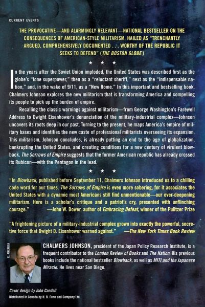 From the author of the prophetic national bestseller Blowback, a startling look at militarism, American style, and its consequences abroad and at home In the years after the Soviet Union imploded, the United States was described first as the globe's "lone superpower," then as a "reluctant sheriff," next as the "indispensable nation," and now, in the wake of 9/11, as a "New Rome." Here, Chalmers Johnson thoroughly explores the new militarism that is transforming America and compelling its people to pick up the burden of empire. Reminding us of the classic warnings against militarism-from George Washington's farewell address to Dwight Eisenhower's denunciation of the military-industrial complex-Johnson uncovers its roots deep in our past. Turning to the present, he maps America's expanding empire of military bases and the vast web of services that supports them. He offers a vivid look at the new caste of professional warriors who have infiltrated multiple branches of government, who classify as "secret" everything they do, and for whom the manipulation of the military budget is of vital interest. Among Johnson's provocative conclusions is that American militarism is putting an end to the age of globalization and bankrupting the United States, even as it creates the conditions for a new century of virulent blowback. The Sorrows of Empire suggests that the former American republic has already crossed its Rubicon-with the Pentagon leading the way.