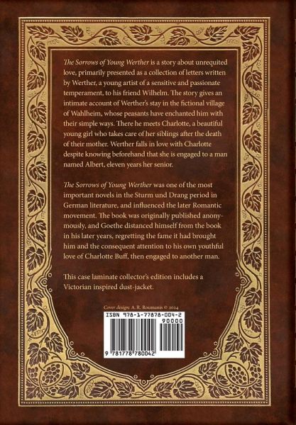 The Sorrows of Young Werther is a story about unrequited love, primarily presented as a collection of letters written by Werther, a young artist of a sensitive and passionate temperament, to his friend Wilhelm. The story gives an intimate account of Werther's stay in the fictional village of Wahlheim, whose peasants have enchanted him with their simple ways. There he meets Charlotte, a beautiful young girl who takes care of her siblings after the death of their mother. Werther falls in love with Charlotte despite knowing beforehand that she is engaged to a man named Albert, eleven years her senior. The Sorrows of Young Werther was one of the most important novels in the Sturm und Drang period in German literature, and influenced the later Romantic movement. The book was originally published anonymously, and Goethe distanced himself from the book in his later years, regretting the fame it had brought him and the consequent attention to his own youthful love of Charlotte Buff, then engaged to another man. This case laminate collector's edition includes a Victorian inspired dust-jacket.