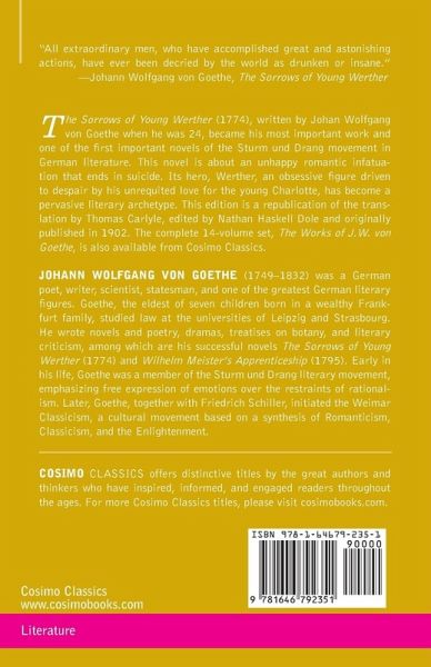 "All extraordinary men, who have accomplished great and astonishing actions, have ever been decried by the world as drunken or insane." —Johann Wolfgang von Goethe, in The Sorrows of Young Werther The Sorrows of Young Werther (1774), written by Johan Wolfgang von Goethe when he was 24, became his most important work and one of the first important novels of the Sturm und Drang movement in German literature. This novel is about an unhappy romantic infatuation that ends in suicide. Its hero, Werther, an obsessive figure driven to despair by his unrequited love for the young Charlotte, has become a pervasive literary archetype. This edition is a republication of the translation by Thomas Carlyle, edited by Nathan Haskell Dole and originally published in 1902. The complete 14-volume set, The Works of J.W. von Goethe, is also available from Cosimo Classics.