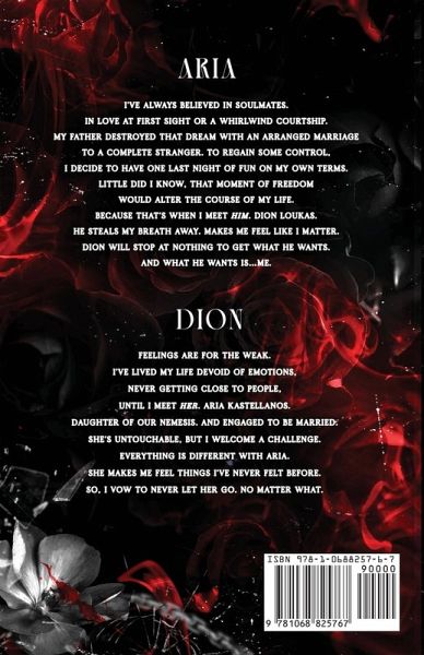 Aria I've always believed in soulmates. In love at first sight or a whirlwind courtship. My father destroyed that dream with an arranged marriage to a complete stranger. To regain some control, I decide to have one last night of fun on my own terms. Little did I know, that moment of freedom would alter the course of my life. Because that's when I meet him. Dion Loukas. He steals my breath away. Makes me feel like I matter. Dion will stop at nothing to get what he wants. And what he wants is...me. Dion Feelings are for the weak. I've lived my life devoid of emotions, never getting close to people. Until I meet her. Aria Kastellanos. Daughter of our nemesis. And engaged to be married. She's untouchable, but I welcome a challenge. Everything is different with Aria. She makes me feel things I've never felt before. So, I vow to never let her go. No matter what.