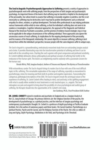 The Soul in Anguish: Psychotherapeutic Approaches to Suffering presents a variety of approaches to psychotherapeutic work with suffering people, from the perspectives of both Jungian and psychoanalytic psychology. An important theme of the book is that suffering may be harmful or helpful to the development of the personality. Our culture tends to assume that suffering is invariably negative or pointless, but this is not necessarily so; suffering may be destructive, but it may lead to positive developments such as enhanced empathy for others, wisdom, or spiritual development. The book offers professionals in any helping profession various frameworks within which to view suffering, so that the individual's suffering does not seem to be random or meaningless. Cognitive-behavioral approaches, the approach of the Diagnostic and Statistical Manual of the American Psychiatric association, and the promise of evidence-based strategies may or may not be applicable to the unique circumstances of the suffering individual. These approaches also ignore the unconscious sources of much suffering, its implications for the ongoing development of the personality, and the nuances of the therapeutic relationship. We cannot objectify or measure suffering; suffering is best viewed from within the individual's perspective, because people with the same diagnosis suffer in unique ways. The Soul in Anguish is a groundbreaking, meticulously researched study from an outstanding Jungian analyst and scholar. It provides illuminating ways into the transformative potential of suffering and how it can be dealt with in the consulting room. Charting the soul's agonies with great compassion and profound sensitivity, Dr. Corbett skillfully delineates clinical, philosophical and spiritual concepts of suffering that testify to the endurance of the human spirit. This book is an enlightening read for anybody with a passionate concern for the human soul. - Ursula Wirtz, PhD, Jungian Analyst, Author of Trauma and Beyond: The Mystery of Transformation With extraordinary candor The Soul in Anguish brings its readers face to face with one of the most difficult topics in life, suffering. This remarkable exploration of the range of suffering, especially as encountered in psychotherapy, mines for meaning and finds both its positive and negative expressions. Transcending the categorical, pathological descriptions of the DSM, The Soul in Anguish reveals the archetypal nature of the experience of suffering. Dr. Lionel Corbett offers healing to mind, soul and body, in this uplifting engagement with what is usually either avoided in most treatments or only touched upon, i.e., anguish. This book reimagines our pain and anguish to bring about the possibility of a true psychological and soulful grasp of suffering. No therapist should miss the opportunities of Dr. Corbett's rich study. - Joe Cambray, Ph.D.,Past-President IAAP,Author DR. LIONEL CORBETT trained in medicine and psychiatry in England and as a Jungian Analyst at the C.G. Jung Institute of Chicago. His primary interests are: the religious function of the psyche, the development of psychotherapy as a spiritual practice, and the interface of Jungian psychology and contemporary psychoanalytic thought. Dr. Corbett is a professor of depth psychology at Pacifica Graduate Institute. He is the author of numerous papers and three books: The Sacred Cauldron: Psychotherapy as a Spiritual Practice, Psyche and the Sacred, and The Religious Function of the Psyche. He is the co-editor of: Jung and Aging, Depth Psychology, Meditations in the Field, and Psychology at the Threshold.