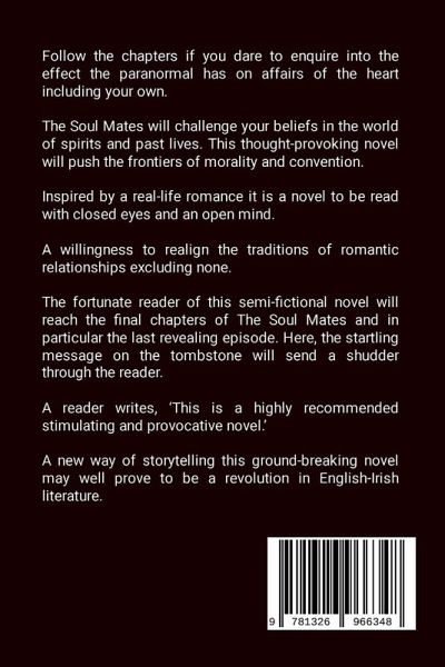 Follow the chapters if you dare to enquire into the effect the paranormal has on affairs of the heart including your own. The Soul Mates will challenge your beliefs in the world of spirits and past lives. This thought-provoking novel will push the frontiers of morality and convention. Inspired by a real-life romance it is a novel to be read with closed eyes and an open mind. A willingness to realign the traditions of romantic relationships excluding none. The fortunate reader of this semi-fictional novel will reach the final chapters of The Soul Mates and in particular the last revealing episode. Here, the startling message on the tombstone will send a shudder through the reader. A reader writes, 'This is a highly recommended stimulating and provocative novel.' A new way of storytelling this ground-breaking novel may well prove to be a revolution in English-Irish literature.