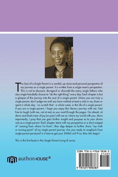 The "The Soul of a Single Parent" is a candid, up-close-and-personal perspective of my journey as a single parent. It is written from a single mom's perspective. This is not to discount, disregard or discredit the many single fathers who also single-handedly choose to "do the right thing" every day. Each chapter is but a glimpse of the journey into the soul of a single parent. Unless you are truly a single parent, don't judge me until you have walked at least a mile in my shoes or spent a whole day - no scratch that - a whole week, in the life of a single parent. If you are a single parent, I hope you enjoy this literary journey with me. Feel free to laugh (with me, not at me) as you read through the pages. Go ahead, sit down and shed a tear of joy (or pain) with me as I share my world with you. More importantly, I pray that you gain further insight and purpose as to your divine role as a single parent. Each chapter starts with my perspective or a short snippet of "coming from where I'm from", then digs deeper to further share "my truth or turning point" of my single parent journey. Are you ready to snapback from single parent paralysis? Is it time to get your SWAG on? If so, then let's begin!
