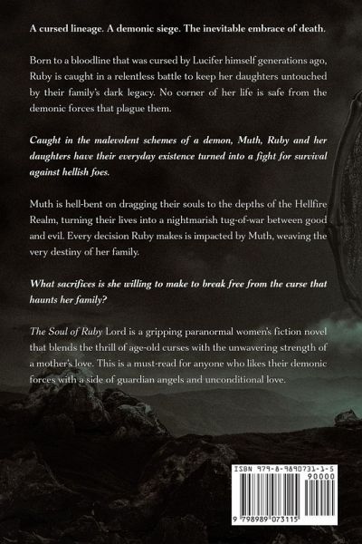 A cursed lineage. A demonic siege. The inevitable embrace of death. Born to a bloodline that was cursed by Lucifer himself generations ago, Ruby is caught in a relentless battle to keep her daughters untouched by their family's dark legacy. No corner of her life is safe from the demonic forces that plague them. Caught in the malevolent schemes of a demon, Muth, Ruby and her daughters have their everyday existence turned into a fight for survival against hellish foes. Muth is hell-bent on dragging their souls to the depths of the Hellfire Realm, turning their lives into a nightmarish tug-of-war between good and evil. Every decision Ruby makes is impacted by Muth, weaving the very destiny of her family, What sacrifices is she willing to make to break free from the curse that haunts her family? The Soul of Ruby Lord is a gripping paranormal women's fiction novel that blends the thrill of age-old curses with the unwavering strength of a mother's love. This is a must-read for anyone who likes their demonic forces with a side of guardian angels and unconditional love.