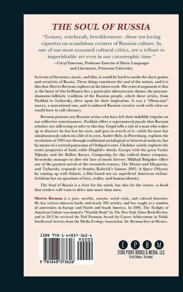 "Ecstasy, witchcraft, bewilderment-these ten loving vignettes on scandalous corners of Russian culture, by one of our most seasoned cultural critics, are a tribute to imperishable art even in our catastrophic time." -Caryl Emerson, Professor Emerita of Slavic Languages and Literatures, Princeton University In terms of literature, music, and film, it would be hard to outdo the sheer genius and creativity of Russia. These things constitute the soul of the nation, and it is this that Morris Berman explores in his latest work, The Soul of Russia. His central argument is that at the heart of this brilliance lies a particular idiosyncratic theme: the peasant-shamanic-folkloric tradition of the Russian people, which these artists, from Pushkin to Tarkovsky, drew upon for their inspiration. It was a "Dionysian" source, a nonrational one, and it endowed Russian creative work with what we would have to call vibrancy. Berman presents ten Russian artists who have left their indelible imprint on our collective consciousness. Pushkin offers a supernatural puzzle that Russian scholars are still trying to solve to this day. Gogol tells a tale of a man who wakes up to discover he has lost his nose, and goes in search of it-while his nose has simultaneously taken on a life of its own. Andrei Bely, in Petersburg, explains the revolution of 1905 not through traditional sociological or historical analysis, but by means of a surreal panorama of Oedipal events. Chekhov wittily explores the erotic properties of food, while Diaghilev shocks Europe with the great Vaslav Nijinsky and the Ballets Russes. Composing for this radical dance company, Stravinsky manages to alter the face of music forever. Mikhail Bulgakov offers one of the greatest novels of the twentieth century, The Master and Margarita, and Tarkovsky responds to Stanley Kubrick's famous 2001: A Space Odyssey by coming up with Solaris, a film based not on superficial American techno-fetishism but on questions of love, reality, and human identity. The Soul of Russia is a feast for the mind, but also for the senses-a book that readers will want to delve into more than once. This book is also available from Echo Point Books as a paperback (ISBN 1648373631).