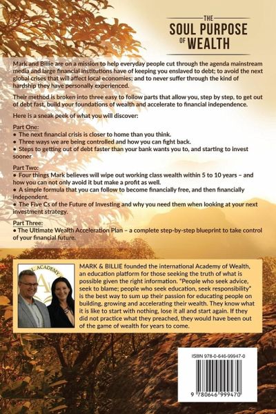 Mark & Billie are on a mission to help everyday people cut through the main stream media and large financial institutions agenda to keep you enslaved to debt… to avoid the next global crises that will affect local economies… and to never suffer through the kind of hardship they have personally experienced. Broken into three easy to follow parts that allow you, step by step get out of debt fast, build your foundations of wealth and then accelerate you to financial independence. Here is a sneak peek to what you will discover Part One; The next financial crises is closer to home than you think. Three ways we are being controlled and how you can fight back Steps to take to get out of debt faster than your bank wants you to and start investing sooner Part two; Four reasons Mark believes will wipe out working class wealth within 5 to 10 years' tops and how you can not only avoid it, but profit as well. A simple formula that you can follow to become financially free, then financially independent. The Five C's of The Future of Investing and why you need them when looking at your next investment strategy. Part Three; The Ultimate Wealth Acceleration Plan - A complete step by step blue print to take control of your financial future. MARK & BILLIE: founded the international Academy of Wealth, an education platform for those seeking the truth of what is possible given the right information. "people who seek advice, seek to blame. People who seek education, seek responsibility" is the best way to sum up their passion for educating people on building, growing and accelerating their wealth. They know what it is like to start with nothing, lose it all and start again. If they did not practice what they preach, they would have out of the game of wealth for years.