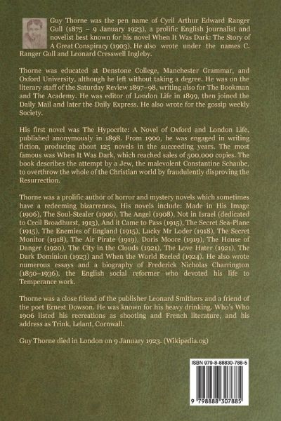 The storyline is pretty basic, mad scientist falls to the dark side, but the characters are intriguing and more importantly the writing style, that slow, contemplating description of events, people, actions and reactions made this into a very good read indeed. (Andrea M) About the Author: Guy Thorne was the pen name of Cyril Arthur Edward Ranger Gull (1875 - 9 January 1923), a prolific English journalist and novelist best known for his novel When It Was Dark: The Story of A Great Conspiracy (1903). He also wrote under the names C. Ranger Gull and Leonard Cresswell Ingleby. Thorne was educated at Denstone College, Manchester Grammar, and Oxford University, although he left without taking a degree. He was on the literary staff of the Saturday Review 1897-98, writing also for The Bookman and The Academy. He was editor of London Life in 1899, then joined the Daily Mail and later the Daily Express. He also wrote for the gossip weekly Society. His first novel was The Hypocrite: A Novel of Oxford and London Life, published anonymously in 1898. From 1900, he was engaged in writing fiction, producing about 125 novels in the succeeding years. The most famous was When It Was Dark, which reached sales of 500,000 copies. The book describes the attempt by a Jew, the malevolent Constantine Schaube, to overthrow the whole of the Christian world by fraudulently disproving the Resurrection. After its publication, the Bishop of London preached about When It Was Dark at Westminster Abbey. Calling it "a remarkable work of fiction" he said it depicts how the world would be if the Resurrection were proved to be a gigantic fraud. ". . .you feel the darkness creeping round the world, you see . . . crime and violence increase in every part of the world. When you see how darkness settles down upon the human spirit, regarding the Christian record as a fable, then you quit with something like adequate thanksgiving, and thank God it is light because of the awful darkness when it was dark." When It Was Dark has been criticised for its stereotyping of Jews and their portrayal as intent on destroying what Thorne viewed as the most valuable element of British life - the Christian faith and the spiritual values associated with it. Other critics have also labelled the book as anti-Semitic. Thorne was a prolific author of horror and mystery novels which sometimes have a redeeming bizarreness. His novels include: Made in His Image (1906), The Soul-Stealer (1906), The Angel (1908), Not in Israel (dedicated to Cecil Broadhurst, 1913), And it Came to Pass (1915), The Secret Sea-Plane (1915), The Enemies of England (1915), Lucky Mr Loder (1918), The Secret Monitor (1918), The Air Pirate (1919), Doris Moore (1919), The House of Danger (1920), The City in the Clouds (1921), The Love Hater (1921), The Dark Dominion (1923) and When the World Reeled (1924). He also wrote numerous essays and a biography of Frederick Nicholas Charrington (1850-1936), the English social reformer who devoted his life to Temperance work. Thorne was a close friend of the publisher Leonard Smithers and a friend of the poet Ernest Dowson. He was known for his heavy drinking. Who's Who 1906 listed his recreations as shooting and French literature, and his address as Trink, Lelant, Cornwall. Guy Thorne died in London on 9 January 1923. (Wikipedia.org)