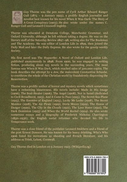 The storyline is pretty basic, mad scientist falls to the dark side, but the characters are intriguing and more importantly the writing style, that slow, contemplating description of events, people, actions and reactions made this into a very good read indeed. (Andrea M) About the Author: Guy Thorne was the pen name of Cyril Arthur Edward Ranger Gull (1875 - 9 January 1923), a prolific English journalist and novelist best known for his novel When It Was Dark: The Story of A Great Conspiracy (1903). He also wrote under the names C. Ranger Gull and Leonard Cresswell Ingleby. Thorne was educated at Denstone College, Manchester Grammar, and Oxford University, although he left without taking a degree. He was on the literary staff of the Saturday Review 1897-98, writing also for The Bookman and The Academy. He was editor of London Life in 1899, then joined the Daily Mail and later the Daily Express. He also wrote for the gossip weekly Society. His first novel was The Hypocrite: A Novel of Oxford and London Life, published anonymously in 1898. From 1900, he was engaged in writing fiction, producing about 125 novels in the succeeding years. The most famous was When It Was Dark, which reached sales of 500,000 copies. The book describes the attempt by a Jew, the malevolent Constantine Schaube, to overthrow the whole of the Christian world by fraudulently disproving the Resurrection. After its publication, the Bishop of London preached about When It Was Dark at Westminster Abbey. Calling it "a remarkable work of fiction" he said it depicts how the world would be if the Resurrection were proved to be a gigantic fraud. ". . .you feel the darkness creeping round the world, you see . . . crime and violence increase in every part of the world. When you see how darkness settles down upon the human spirit, regarding the Christian record as a fable, then you quit with something like adequate thanksgiving, and thank God it is light because of the awful darkness when it was dark." When It Was Dark has been criticised for its stereotyping of Jews and their portrayal as intent on destroying what Thorne viewed as the most valuable element of British life - the Christian faith and the spiritual values associated with it. Other critics have also labelled the book as anti-Semitic. Thorne was a prolific author of horror and mystery novels which sometimes have a redeeming bizarreness. His novels include: Made in His Image (1906), The Soul-Stealer (1906), The Angel (1908), Not in Israel (dedicated to Cecil Broadhurst, 1913), And it Came to Pass (1915), The Secret Sea-Plane (1915), The Enemies of England (1915), Lucky Mr Loder (1918), The Secret Monitor (1918), The Air Pirate (1919), Doris Moore (1919), The House of Danger (1920), The City in the Clouds (1921), The Love Hater (1921), The Dark Dominion (1923) and When the World Reeled (1924). He also wrote numerous essays and a biography of Frederick Nicholas Charrington (1850-1936), the English social reformer who devoted his life to Temperance work. Thorne was a close friend of the publisher Leonard Smithers and a friend of the poet Ernest Dowson. He was known for his heavy drinking. Who's Who 1906 listed his recreations as shooting and French literature, and his address as Trink, Lelant, Cornwall. Guy Thorne died in London on 9 January 1923. (Wikipedia.org)