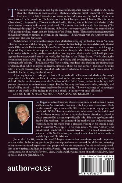The mysterious millionaire and highly successful corporate executive, Mathew Anthony, alias The Mailman, is back in action. Mathew and his identical twin brother, Thomas, have survived a failed assassination attempt, intended to close the book on those who were involved in the murder of The Mailman's handler, CIA agent, Scott Johnson (The Corporate Chameleon). Regrettably, Thomas Anthony's wife, Sienna, was an inadvertent victim of the assassination attempt and she was terminated. This event launched a retaliation journey (The Mainstreet Messenger) by The Mailman and his brother who were successful with the extermination of all parties involved, except one, the President of the United States. The assassination saga targeting the Anthony Brothers remains an irritant to the President. The chronicle with the Anthony brothers continues (The Soul Survivor). Both brothers have drastically changed their ideals after avenging the death of Sienna Anthony. Thomas continues with his campaign quest to become the first Independent candidate to be elected to the Office of the President of the United States. Subversive activities are uncovered which suggest the possibility of another attempt on the lives of the Anthony brothers is being constructed. This information reinforces the brothers' conclusion that they must devise a plan which will pit them against the most powerful man in the world, the President of the United States. The Mailman, the consummate assassin, will face the ultimate test of will and skill by deciding to undertake his most unimaginable 'delivery'. The Mailman who fears nothing, spends no time thinking about aspirations or destiny, thus, when an exploit is needed, cares little about his own demise. The action he must take is straight forward; take the sword of Lady Justice, rebalance her scale, and then remove her blindfold for her to judge his handiwork. A journey is about to take place, that will not only affect Thomas and Mathew Anthony's respective lives, but also the lives of the very nation the brothers so unconventionally love and defend. To the brothers, one man, the President of the United States, evolves from being a life's passage distraction to an imminent danger. For the Anthony brothers, every value, principle, and belief will be tested ... to be entrenched or to be tossed aside. The very existence of the strongest nation in the world will be pushed to the brink of hell, in this survivor-takes-all conflict. SET NO LIMITS, HAVE NO FEAR, AND ALLOW NO REMORSE ...
