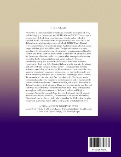 The Soulless is a musical drama about love's torments, the sorrow of loss, and finding joy in the unexpected. RICHARD and VIOLET's marriage is broken; secretly both have sought passion elsewhere, but nobody's satisfied. Violet's dishonesty with her psychoanalyst and lover JACK and Richard's torrential one-night-stand with lively BRIGIT have blasted everyone into their own emotional crises. And mysterious DIANA can no longer hide her grief behind her smile. Tonight fate throws everyone together at the memorial service of a common acquaintance, and facades shatter. The drama starts as people arrive in the lobby of an upscale hotel for the memorial service, and to everyone's relief a competent bartender keeps the drinks coming. Richard and Violet bicker, try to keep emotionally steady, and attempt to deflect each other from romantic exploits with Brigit and Jack. (It takes Richard a while to realize he already had seduced Brigit a couple months earlier-she required an extreme makeover to rebalance.) Meanwhile, Diana discovers the memorial to be a fantastic opportunity to connect with people-at first professionally and then romantically with Jack. Just as everyone's exploits get out of control, the memorial service starts and Act One closes. Act Two begins as the service ends, and people stream out with demeanors and costumes subtly and beautifully transformed. Violet insists that Jack explain their affair to Richard, but increasingly-attractive Diana keeps getting in the way. Richard and Brigit realize that their connection is very deep-their unforgettable one-night-stand had consequences: Richard is in love and Brigit is pregnant. And as the terrified Brigit ferociously defends herself against Richard's continuous aloofness, Violet comes to his rescue. Meanwhile, Diana confesses her love to Jack, who rejects her for Violet. And the play closes with everyone's hearts a little sadder, and a little fuller with love.