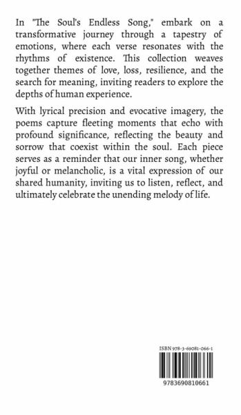 In "The Soul's Endless Song," embark on a transformative journey through a tapestry of emotions, where each verse resonates with the rhythms of existence. This collection weaves together themes of love, loss, resilience, and the search for meaning, inviting readers to explore the depths of human experience. With lyrical precision and evocative imagery, the poems capture fleeting moments that echo with profound significance, reflecting the beauty and sorrow that coexist within the soul. Each piece serves as a reminder that our inner song, whether joyful or melancholic, is a vital expression of our shared humanity, inviting us to listen, reflect, and ultimately celebrate the unending melody of life.