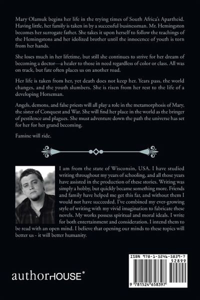 Mary Olamuk begins her life in the trying times of South Africa's Apartheid. Having little, her family is taken in by a successful businessman. Mr. Hemingston becomes her surrogate father. She takes it upon herself to follow the teachings of the Hemingstons and her idolized brother until the innocence of youth is torn from her hands. She loses much in her lifetime, but still she continues to strive for her dream of becoming a doctor—a healer to those in need regardless of color or class. All was on track, but fate often places us on another road. Her life is taken from her, yet death does not keep her. Years pass, the world changes, and the youth slumbers. She is risen from her rest to the life of a developing Horseman. Angels, demons, and false priests will all play a role in the metamorphosis of Mary, the sister of Conquest and War . She will find her place in the world as the bringer of pestilence and plagues. She must adventure down the path the universe has set for her for her grand becoming. Famine will ride.
