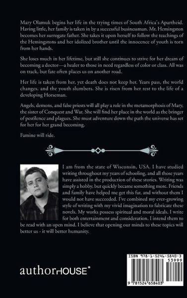 Mary Olamuk begins her life in the trying times of South Africa's Apartheid. Having little, her family is taken in by a successful businessman. Mr. Hemingston becomes her surrogate father. She takes it upon herself to follow the teachings of the Hemingstons and her idolized brother until the innocence of youth is torn from her hands. She loses much in her lifetime, but still she continues to strive for her dream of becoming a doctor—a healer to those in need regardless of color or class. All was on track, but fate often places us on another road. Her life is taken from her, yet death does not keep her. Years pass, the world changes, and the youth slumbers. She is risen from her rest to the life of a developing Horseman. Angels, demons, and false priests will all play a role in the metamorphosis of Mary, the sister of Conquest and War . She will find her place in the world as the bringer of pestilence and plagues. She must adventure down the path the universe has set for her for her grand becoming. Famine will ride.