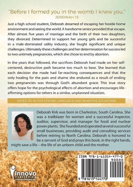 Just a high school student, Deborah dreamed of escaping her hostile home environment and seeing the world. A handsome senior provided that escape. After almost five years of marriage and the birth of their two daughters, they divorced. Determined to support her young girls and be successful in a male-dominated utility industry, she was a trailblazer with significant and unique challenges. Ultimately these challenges and her determination for success led to two untimely pregnancies, which she chose to end by abortion. In the years that followed, the sacrifices Deborah had made on her self-centered, destructive path became too much to bear. She learned that each decision she made had far-reaching consequences and that the only healing for the pain and shame she endured as a result of ending two pregnancies was through God's abundant grace. This true story offers hope for the psychological effects of abortion and encourages life-affirming options for others in a similar, unplanned situation. "Before I formed you in the womb I knew you." (Jer 1:5)