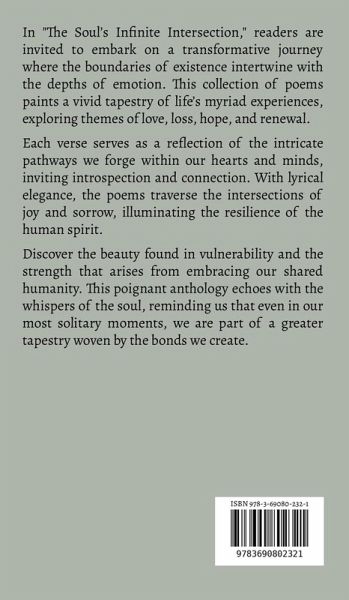 In "The Soul's Infinite Intersection," readers are invited to embark on a transformative journey where the boundaries of existence intertwine with the depths of emotion. This collection of poems paints a vivid tapestry of life's myriad experiences, exploring themes of love, loss, hope, and renewal. Each verse serves as a reflection of the intricate pathways we forge within our hearts and minds, inviting introspection and connection. With lyrical elegance, the poems traverse the intersections of joy and sorrow, illuminating the resilience of the human spirit. Discover the beauty found in vulnerability and the strength that arises from embracing our shared humanity. This poignant anthology echoes with the whispers of the soul, reminding us that even in our most solitary moments, we are part of a greater tapestry woven by the bonds we create.