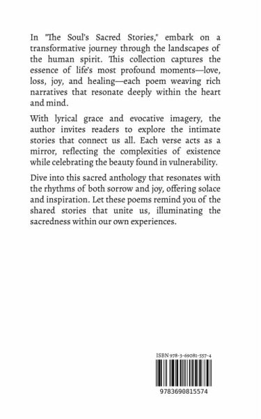 In "The Soul's Sacred Stories," embark on a transformative journey through the landscapes of the human spirit. This collection captures the essence of life's most profound moments-love, loss, joy, and healing-each poem weaving rich narratives that resonate deeply within the heart and mind. With lyrical grace and evocative imagery, the author invites readers to explore the intimate stories that connect us all. Each verse acts as a mirror, reflecting the complexities of existence while celebrating the beauty found in vulnerability. Dive into this sacred anthology that resonates with the rhythms of both sorrow and joy, offering solace and inspiration. Let these poems remind you of the shared stories that unite us, illuminating the sacredness within our own experiences.