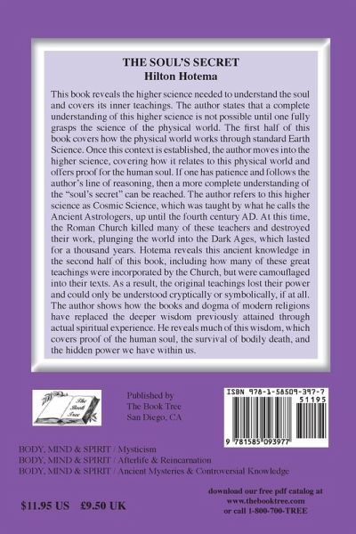 This book reveals the higher science needed to understand the soul and covers its inner teachings. The author states that a complete understanding of this higher science is not possible until one fully grasps the science of the physical world. The first half of this book covers how the physical world works through standard Earth Science. Once this context is established, the author moves into the higher science, covering how it relates to this physical world and offers proof for the human soul. If one has patience and follows the author’s line of reasoning, then a more complete understanding of the "soul’s secret" can be reached. The author refers to this higher science as Cosmic Science, which was taught by what he calls the Ancient Astrologers, up until the fourth century AD. At this time, the Roman Church killed many of these teachers and destroyed their work, plunging the world into the Dark Ages, which lasted for a thousand years. Hotema reveals this ancient knowledge in the second half of this book, including how many of these great teachings were incorporated by the Church, but were camouflaged into their texts. As a result, the original teachings lost their power and could only be understood cryptically or symbolically, if at all. The author shows how the books and dogma of modern religions have replaced the deeper wisdom previously attained through actual spiritual experience. He reveals much of this wisdom, which covers proof of the human soul, the survival of bodily death, and the hidden power we have within us.