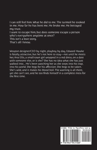 I can still feel him. What he did to me. The turmoil he evoked in me. How far he has bent me. He broke me. He betrayed my trust. I want to escape him, but does someone escape a person who's everywhere anytime at once? This isn't a love story. That's all I know. - -Weapon designer/CEO by night, playboy by day, Edward Hawke is fatally attractive, but he's not here to stay-not until he meets her, Ana Ellis, a small-town girl wrapped in a red dress, on a date with someone else, or is she? She has no idea what she has just walked into... He's been watching her as she steps into his trap, into his world. She begs for his affection. She begs to be taken. She's wild, and it makes his blood boil. The warning is all there, yet she can't see, and he too finds himself in a complete mess for the first time.