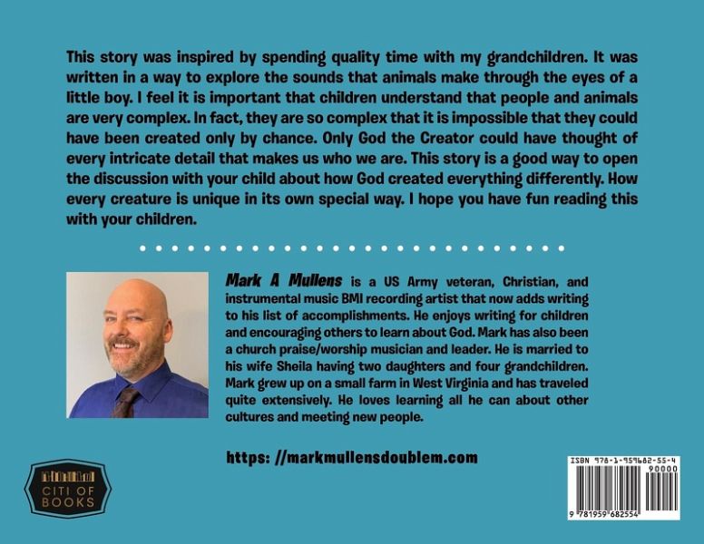 This story was inspired by spending quality time with my grandchildren. It was written in a way to explore the sounds that animals make through the eyes of a little boy. I feel it is important that children understand that people and animals are very complex. In fact, they are so complex that it is impossible that they could have been created only by chance. Only God the Creator could have thought of every intricate detail that makes us who we are. This story is a good way to open the discussion with your child about how God created everything differently. Now every creature is unique in its own special way. I hope you have fun reading this with your children.