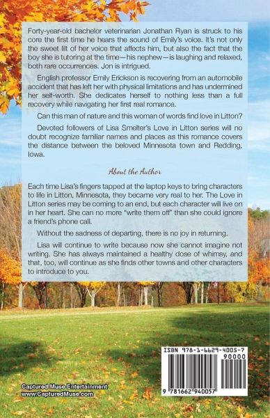 Forty-year-old bachelor veterinarian Jonathan Ryan is struck to his core the first time he hears the sound of Emily's voice. It's not only the sweet lilt of her voice that affects him, but also the fact that the boy she is tutoring at the time-his nephew-is laughing and relaxed, both rare occurrences. Jon is intrigued. English professor Emily Erickson is recovering from an automobile accident that has left her with physical limitations and has undermined her self-worth. She dedicates herself to nothing less than a full recovery while navigating her first real romance. Can this man of nature and this woman of words find love in Litton? Devoted followers of Lisa Smelter's Love in Litton series will no doubt recognize familiar names and places as this romance covers the distance between the beloved Minnesota town and Redding, Iowa.