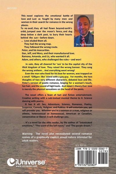 This novel explores the emotional battle of love and lust as fought by many men and women in their search of romance in the wrong places. To no avail, they all had flown beyond earth's orbit, jumped over the moon's fence, and dug deep below a dark past to bury their hearts behind the sun before dawn. Love eluded them all. They had the wrong map. They followed the wrong route. Peter and his insecurities. Dan, Jeff, Mary, and their manufactured love. Ramona, Amanda, and Liz who wanted it all. Adam and others who challenged the rules and won! In vain, they all cheered for "sex" to be the capital city of the illicit kingdom of love. They raised the wrong banner. They sang the wrong anthem. And everything went wrong! Even the man who lived for his love for women was trapped on a small Gilligan-like island with a gay guy. For months, the two thoughts of two very different characters debated love and life. Peter's version of poetic romance longing for a woman's touch, her hair, and the sound of high heels. And Adam's theory that love is merely the physical sensations on the head of the penis. The novel offers a feast of factual and fictional entertainment, a creative writing with a subtextual musical theme to it, and science dancing with poetry. It has it all: sex, adventure, science, romance, poetry, suspense, comedy, religion, and politics. It will entertain you yet will provoke you. Whether you're a woman or a man, religious or atheist, heterosexual or homosexual, American or Canadian, conservative or liberal, it will challenge you. It's a novel for the elite reader by the author of Intoxicated Emotions, The Scent of the Full Moon, and The Purple Dream. Warning: The novel plot necessitated several romance scenes of a graphically explicit sexual nature intended for adult readers.