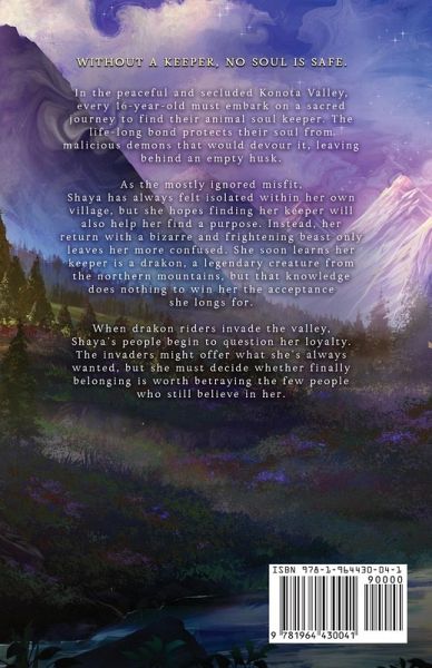 Without a keeper, no soul is safe. In the peaceful and secluded Konota Valley, every 16-year-old must embark on a sacred journey to find their animal soul keeper. The life-long bond protects their soul from malicious demons that would devour it, leaving behind an empty husk. As the mostly ignored misfit, Shaya has always felt isolated within her own village, but she hopes finding her keeper will also help her find a purpose. Instead, her return with a bizarre and frightening beast only leaves her more confused. She soon learns her keeper is a drakon, a legendary creature from the northern mountains, but that knowledge does nothing to win her the acceptance she longs for. When drakon riders invade the valley, Shaya's people begin to question her loyalty. The invaders might offer what she's always wanted, but she must decide whether finally belonging is worth betraying the few people who still believe in her.