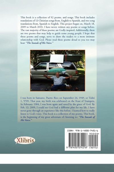 This book is a collection of 92 poems and songs that I was used as a vessel to write, and includes 13 Contemporary Christian Music Translations from English to Spanish, and 1 song translation from Spanish to English. This collection was all written, edited, produced and then published by Nestor Gonzalez during the period of March 18, 2009 to March 2010. Prior to the time period noted, I have never, in my life, xwritten a poem or song. The vast majority of the poems were Godly inspired. With the exception of 2 somewhat explicit life stories, that should serve as counsel to young people; it is my hope that these poems and songs, serve to draw every reader to a closer and more intimate relationship with God. I pray that you all read these poems aloud and that you too hear The Sounds of His Voice.