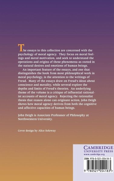 The essays in this collection are concerned with the psychology of moral agency. They focus on moral feelings and moral motivation, and seek to understand the operations and origins of these phenomena as rooted in the natural desires and emotions of human beings. An important feature of the essays, and one that distinguishes the book from most philosophical work in moral psychology, is the attention to the writings of Freud. Many of the essays draw on Freud's ideas about conscience and morality, while several explore the depths and limits of Freud's theories. An underlying theme of the volume is a critique of influential rationalist accounts of moral agency. John Deigh shows that one can subject the principles of morality to rational inquiry without thereby holding that reason alone can originate action.