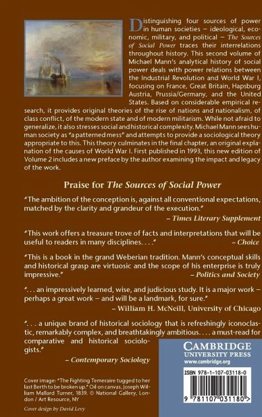 Distinguishing four sources of power in human societies - ideological, economic, military and political - The Sources of Social Power traces their interrelations throughout human history. This second volume deals with power relations between the Industrial Revolution and the First World War, focusing on France, Great Britain, Hapsburg Austria, Prussia/Germany and the United States. Based on considerable empirical research, it provides original theories of the rise of nations and nationalism, of class conflict, of the modern state and of modern militarism. While not afraid to generalize, it also stresses social and historical complexity. Michael Mann sees human society as 'a patterned mess' and attempts to provide a sociological theory appropriate to this, his final chapter giving an original explanation of the causes of the First World War. First published in 1993, this new edition of Volume 2 includes a new preface by the author examining the impact and legacy of the work.