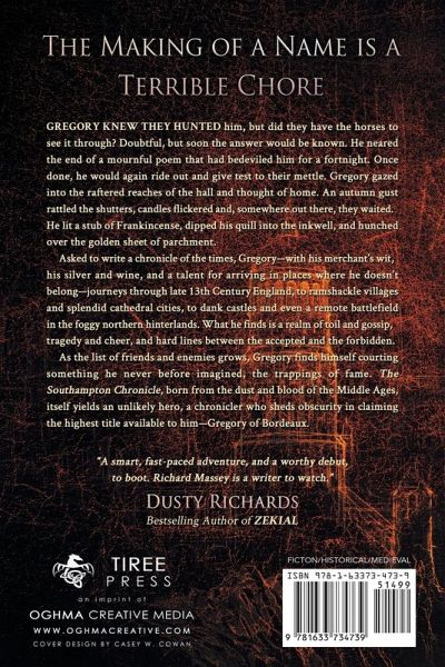 The Making of a Name is a Terrible Chore Gregory knew they hunted him, but did they have the horses to see it through? Doubtful, but soon the answer would be known. He neared the end of a mournful poem that had bedeviled him for a fortnight. Once done, he would again ride out and give test to their mettle. Gregory gazed into the raftered reaches of the hall and thought of home. An autumn gust rattled the shutters, candles flickered and, somewhere out there, they waited. He lit a stub of Frankincense, dipped his quill into the inkwell, and hunched over the golden sheet of parchment. Asked to write a chronicle of the times, Gregory-with his merchant's wit, his silver and wine, and a talent for arriving in places where he doesn't belong-journeys through late 13th Century England, to ramshackle villages and splendid cathedral cities, to dank castles and even a remote battlefield in the foggy northern hinterlands. What he finds is a realm of toil and gossip, tragedy and cheer, and hard lines between the accepted and the forbidden. As the list of friends and enemies grows, Gregory finds himself courting something he never before imagined, the trappings of fame. The Southampton Chronicle, born from the dust and blood of the Middle Ages, itself yields an unlikely hero, a chronicler who sheds obscurity in claiming the highest title available to him-Gregory of Bordeaux.