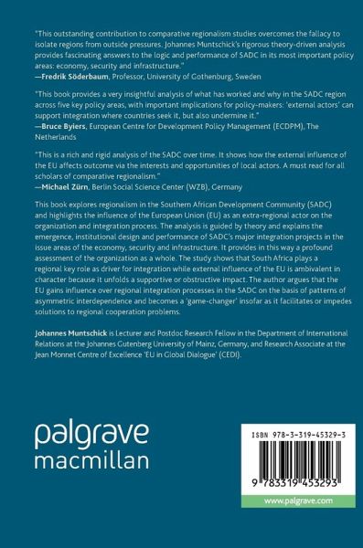 This book explores regionalism in the Southern African Development Community (SADC) and highlights the influence of the European Union (EU) as an extra-regional actor on the organization and integration process. The analysis is guided by theory and explains the emergence, institutional design and performance of SADC's major integration projects in the issue areas of the economy, security and infrastructure. It provides in this way a profound assessment of the organization as a whole. The study shows that South Africa plays a regional key role as driver for integration while external influence of the EU is ambivalent in character because it unfolds a supportive or obstructive impact. The author argues that the EU gains influence over regional integration processes in the SADC on the basis of patterns of asymmetric interdependence and becomes a 'game-changer' insofar as it facilitates or impedes solutions to regional cooperation problems.