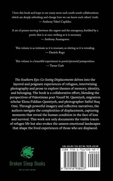 The Southern Eye: Co-Seeing Displacements delves into the layered and poignant experiences of refugees, intertwining photography and prose to explore themes of memory, identity, and belonging. The book is a collaborative effort, blending the perspectives of Palestinian poet Yousif M. Qasmiyeh, migration scholar Elena Fiddian-Qasmiyeh, and photographer Saiful Huq Omi. Through powerful imagery and reflective narratives, the authors navigate the complexities of displacement, capturing moments that reveal the human condition in the face of loss and survival. This work not only documents the visible traces of refugee life but also evokes the unseen emotional landscapes that shape the lived experiences of those who are displaced.