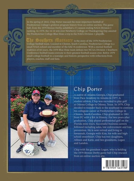 Throughout my interview process for The Southern Massacre, player after player and person after person had specific memories of the 1979 Presbyterian College football team. Bruce Ollis, 1979 PC OG and Co-Captain, told how he had a banner in his high school gym. Bruce, like many other Presbyterian College graduates, was part of PC's legendary Coach Cally Gault's coaching tree. The banner stated, "Football lasts 48 minutes. Memories are for a lifetime!" In years to come, the Presbyterian College record books would include the 1979 Blue Hose football team with an overall record of 11-2. Many would look at the record and think "That was pretty good!" Success for the 1979 Blue Hose certainly did not come overnight. The blueprint for success began in the mid 1970's. I was afraid the significance and achievements of the 1979 Presbyterian College Blue Hose football team would be lost forever. I decided to document the season and The Southern Massacre was written. Narratives of the games are captured by newspaper articles. The book reflects and reminds us of social, political and economic issues of 1979. Portions of the layout will be nostalgic to many. The format is different as I have emphasized the reflections from my interviews of the players, coaches and others associated with the team looking back years later. I have concentrated on the performance on the field in what I call "In between the lines." The inspiration to document this story began in the spring of 2022. While searching Presbyterian College on eBay, I came across an auction for a football. Closer examination of the auction revealed that the football, which somehow got in the marketplace, was the most historical football in Presbyterian College football history. It was the game ball from the 1979 Bronze Derby game, signed by the team. I was a sophomore at PC in 1979. I witnessed this historical team. They were my classmates and friends. I was afraid that the ball would fall in the hands of a football autograph collector and the ball would never be seen again. I purchased and rescued the ball!