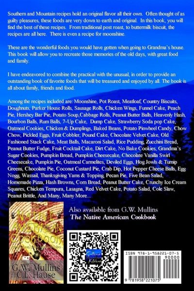 Southern and Mountain recipes hold an original flavor all their own. Often thought of as guilty pleasures, these foods are very down to earth and original. In this book, you will find the best of these recipes. From traditional post roast, to buttermilk biscuit, the recipes are all here. There is even a recipe for moonshine. These are the wonderful foods you would have gotten when going to Grandma's house. This book will allow you to recreate those memories of the old days, with great food and family. I have endeavored to combine the practical with the unusual, in order to provide an outstanding book of favorite foods that will be treasured and enjoyed by all. The book is all about family, friends and food. Among the recipes included are: Moonshine, Pot Roast, Meatloaf, Country Biscuits, Doughnuts, Parker House Rolls, Sausage Rolls, Chicken Wings, Funnel Cake, Peach Pie, Hershey Bar Pie, Potato Soup,Cabbage Rolls, Peanut Butter Balls, Heavenly Hash, Bourbon Balls, Rum Balls, 7-Up Cake, Dump Cake, Strawberry Soda pop Cake, Oatmeal Cookies, Chicken & Dumplings, Baked Beans, Potato Pinwheel Candy, Chow Chow, Pickled Eggs, Fruit Cobbler, Pound Cake, Chocolate Velvet Cake, Old Fashioned Stack Cake, Meat Balls, Macaroni Salad, Rice Pudding, Zucchini Bread, Peanut Butter Fudge, Fruit Cocktail Cake, Dirt Cake, No Bake Cookies, Grandma's Sugar Cookies, Pumpkin Bread, Pumpkin Cheesecake, Chocolate Vanilla Swirl Cheesecake, Pumpkin Pie, Oatmeal Carmelites, Deviled Eggs, Hog Jowls & Turnip Greens, Chocolate Pie, Coconut Custard Pie, Crab Dip, Hot Pepper Cheese Balls, Egg Nogg, Wassail, Thanksgiving Yams & Topping, Pecan Pie, Five Bean Salad, Homemade Pizza, Hash Browns, Corn Bread, Peanut Butter Cake, Crunchy Ice Cream Squares, Chicken Tempura, Lasagna, Red Velvet Cake, Potato Salad, Cole Slaw, Peanut Brittle, And Many, Many More...