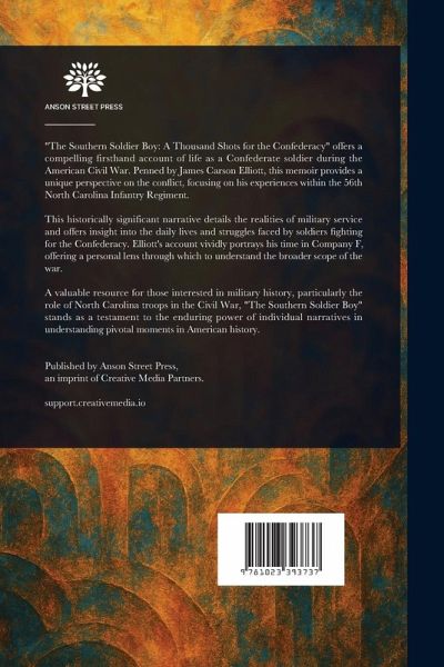 "The Southern Soldier Boy: A Thousand Shots for the Confederacy" offers a compelling firsthand account of life as a Confederate soldier during the American Civil War. Penned by James Carson Elliott, this memoir provides a unique perspective on the conflict, focusing on his experiences within the 56th North Carolina Infantry Regiment. This historically significant narrative details the realities of military service and offers insight into the daily lives and struggles faced by soldiers fighting for the Confederacy. Elliott's account vividly portrays his time in Company F, offering a personal lens through which to understand the broader scope of the war. A valuable resource for those interested in military history, particularly the role of North Carolina troops in the Civil War, "The Southern Soldier Boy" stands as a testament to the enduring power of individual narratives in understanding pivotal moments in American history. This work has been selected by scholars as being culturally important, and is part of the knowledge base of civilization as we know it. This work is in the public domain in the United States of America, and possibly other nations. Within the United States, you may freely copy and distribute this work, as no entity (individual or corporate) has a copyright on the body of the work. Scholars believe, and we concur, that this work is important enough to be preserved, reproduced, and made generally available to the public. We appreciate your support of the preservation process, and thank you for being an important part of keeping this knowledge alive and relevant.
