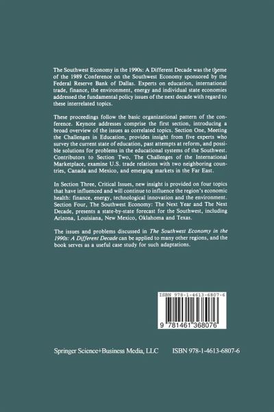 he 1980s began during a great upswing in the Southwest economy, but what lay ahead was a decade of plummeting oil prices, deflated real estatevaluesandunprecedentedbankfailures. Thethemeofthe Federal T Reserve BankofDallas' second annual conferenceon the Southwesteconomy, "The 1990s: A Different Decade," reflected our belief that the beginning ofthe new decade would mark a turn toward economic strength in the Southwest. The conference, held Oct. 26-27, 1989, at Loews Anatole Hotel in Dallas, Texas, brought together more than 250 interested individuals and speakers for anexchangeofinformationand ideas. Topics rangedfrom the currentcondition of the Southwest economy to the factors shaping the future. Theinfluences on the Southwest economy are diverse but interrelated. For example, the Southwest faces a complex dilemma in reforming its educational system. As conference speakers illustrated many times, education reform and the quality ofour schools are closely linked to the region's,if not the nation's, ability to compete in future world markets. These proceedings follow the basic organizational pattern of the confer ence. Keynote and luncheon addresses appear in the first section, General Meetings-The 1990s: ADifferent Decade, which includes speeches by Bobby R. Inman, admiral, United States Navy (retired), and private investor; Robert H. Boykin, president and chief executive officer of the Federal Reserve Bank of Dallas; WilliamH. Cunningham; presidentofthe UniversityofTexas, Austin;and John B. McCoy, chairman and chief executive officer of Banc One Corp. Session One, Meeting the Challenges in Education, provides insight from five experts, who survey the current state ofeducation, past attempts at reform andpossiblesolutions for problemsintheeducationalsystemsofthe Southwest.
