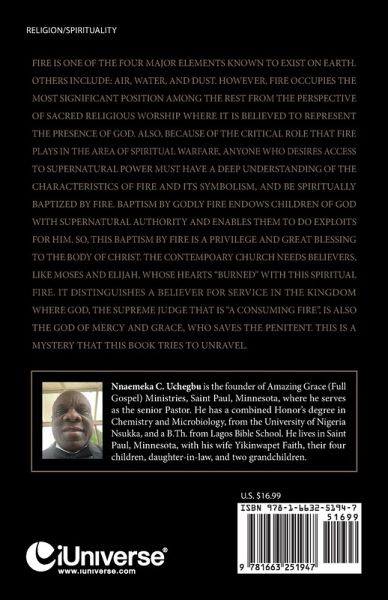 FIRE IS ONE OF THE FOUR MAJOR ELEMENTS KNOWN TO EXIST ON EARTH. OTHERS INCLUDE: AIR, WATER, AND DUST. HOWEVER, FIRE OCCUPIES THE MOST SIGNIFICANT POSITION AMONG THE REST FROM THE PERSPECTIVE OF SACRED RELIGIOUS WORSHIP WHERE IT IS BELIEVED TO REPRESENT THE PRESENCE OF GOD. ALSO, BECAUSE OF THE CRITICAL ROLE THAT FIRE PLAYS IN THE AREA OF SPIRITUAL WARFARE, ANYONE WHO DESIRES ACCESS TO SUPERNATURAL POWER MUST HAVE A DEEP UNDERSTANDING OF THE CHARACTERISTICS OF FIRE AND ITS SYMBOLISM, AND BE SPIRITUALLY BAPTIZED BY FIRE. BAPTISM BY GODLY FIRE ENDOWS CHILDREN OF GOD WITH SUPERNATURAL AUTHORITY AND ENABLES THEM TO DO EXPLOITS FOR HIM. SO, THIS BAPTISM BY FIRE IS A PRIVILEGE AND GREAT BLESSING TO THE BODY OF CHRIST. THE CONTEMPOARY CHURCH NEEDS BELIEVERS, LIKE MOSES AND ELIJAH, WHOSE HEARTS "BURNED" WITH THIS SPIRITUAL FIRE. IT DISTINGUISHES A BELIEVER FOR SERVICE IN THE KINGDOM WHERE GOD, THE SUPREME JUDGE THAT IS "A CONSUMING FIRE", IS ALSO THE GOD OF MERCY AND GRACE, WHO SAVES THE PENITENT. THIS IS A MYSTERY THAT THIS BOOK TRIES TO UNRAVEL.