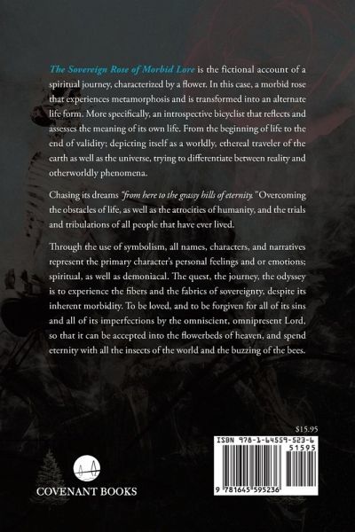 The Sovereign Rose of Morbid Lore is the fictional account of a spiritual journey, characterized by a flower. In this case, a morbid rose that experiences metamorphosis and is transformed into an alternate life form. More specifically, an introspective bicyclist that reflects and assesses the meaning of its own life. From the beginning of life to the end of validity; depicting itself as a worldly, ethereal traveler of the earth as well as the universe, trying to differentiate between reality and otherworldly phenomena. Chasing its dreams "from here to the grassy hills of eternity." Overcoming the obstacles of life, as well as the atrocities of humanity, and the trials and tribulations of all people that have ever lived. Through the use of symbolism, all names, characters, and narratives represent the primary character’s personal feelings and or emotions; spiritual, as well as demoniacal. The quest, the journey, the odyssey is to experience the fibers and the fabrics of sovereignty, despite its inherent morbidity. To be loved, and to be forgiven for all of its sins and all of its imperfections by the omniscient, omnipresent Lord, so that it can be accepted into the flowerbeds of heaven, and spend eternity with all the insects of the world and the buzzing of the bees.