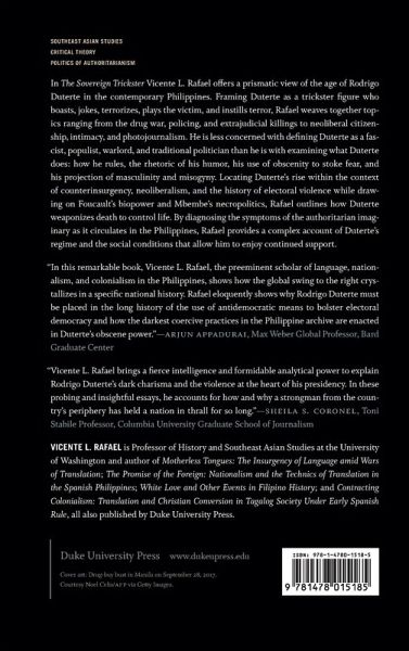 In The Sovereign Trickster Vicente L. Rafael offers a prismatic view of the age of Rodrigo Duterte in the contemporary Philippines. Framing Duterte as a trickster figure who boasts, jokes, terrorizes, plays the victim, and instills terror, Rafael weaves together topics ranging from the drug war, policing, and extrajudicial killings to neoliberal citizenship, intimacy, and photojournalism. He is less concerned with defining Duterte as a fascist, populist, warlord, and traditional politician than he is with examining what Duterte does: how he rules, the rhetoric of his humor, his use of obscenity to stoke fear, and his projection of masculinity and misogyny. Locating Duterte's rise within the context of counterinsurgency, neoliberalism, and the history of electoral violence, while drawing on Foucault's biopower and Mbembe's necropolitics, Rafael outlines how Duterte weaponizes death to control life. By diagnosing the symptoms of the authoritarian imaginary as it circulates in the Philippines, Rafael provides a complex account of Duterte's regime and the social conditions that allow him to enjoy continued support.