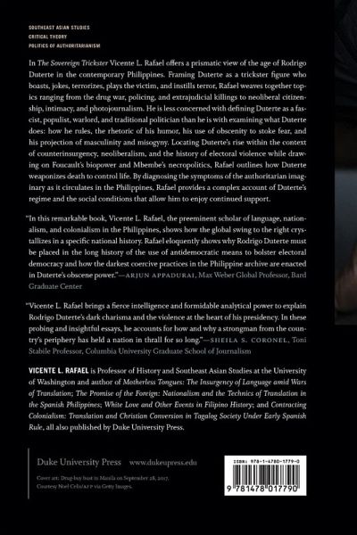 In The Sovereign Trickster Vicente L. Rafael offers a prismatic view of the age of Rodrigo Duterte in the contemporary Philippines. Framing Duterte as a trickster figure who boasts, jokes, terrorizes, plays the victim, and instills terror, Rafael weaves together topics ranging from the drug war, policing, and extrajudicial killings to neoliberal citizenship, intimacy, and photojournalism. He is less concerned with defining Duterte as a fascist, populist, warlord, and traditional politician than he is with examining what Duterte does: how he rules, the rhetoric of his humor, his use of obscenity to stoke fear, and his projection of masculinity and misogyny. Locating Duterte's rise within the context of counterinsurgency, neoliberalism, and the history of electoral violence, while drawing on Foucault's biopower and Mbembe's necropolitics, Rafael outlines how Duterte weaponizes death to control life. By diagnosing the symptoms of the authoritarian imaginary as it circulates in the Philippines, Rafael provides a complex account of Duterte's regime and the social conditions that allow him to enjoy continued support.
