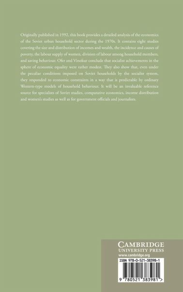 Originally published in 1992, this book provides a detailed analysis of the economics of the Soviet urban household sector during the 1970s. It contains eight studies covering the size and distribution of incomes and wealth, the incidence and causes of poverty, the labour supply of women, division of labour among household members, and saving behaviour. Ofer and Vinokur conclude that socialist achievements in the sphere of economic equality were rather modest. They also show that, even under the peculiar conditions imposed on Soviet households by the socialist system, they responded to economic constraints in a way that is predictable by ordinary Western-type models of household behaviour. It will be an invaluable reference source for specialists of Soviet studies, comparative economics, income distribution and women's studies as well as for government officials and journalists.