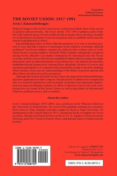 Political change in the Soviet Union never seemed more likely than in the period of glasnost and perestroika. The Soviet Union: 1917-1991 examines some of the less well explored areas of Soviet political and economic life to develop a feasible set of alternatives for future Soviet development and to establish which ones the system is predisposed to select.Katsenelinboigen takes on these difficult questions. Is it wise to develop glasnost in ways that allow masses to participate in the solution of strategic national problems? Can Soviet military expenses be reduced only to direct ones or is the whole Soviet economy military oriented? What explains widespread corruption among Soviet officials? Can market institutions be introduced into the Soviet economy, and if so, how is this best accomplished? Rather than focusing on a single dimension, such as authoritarianism versus democracy, his analysis incorporates multidimensional perspectives (among them, pluralism, division of powers and openness participation of competent and responsible people in decision making) which permit a more precise understanding of the limits of present options and allow him to develop new policy prospects.Although this book is about the Soviet Union, the approaches Katsenelinboigen uses have application in other contexts. His discussion of inflation for example and why it is found in planned as well as market economies has important implications for many developing countries. It will be of interest to those who seek a new perspective on events in the Soviet Union, as well as specialists in international relations, political science, and economics.