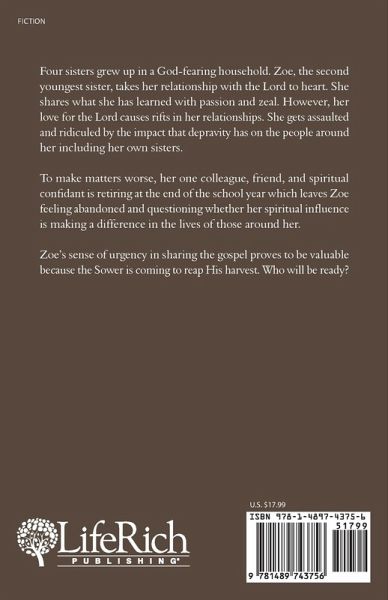 This book is a contemporary version of "The Parable of the Sower and the Seed". Though four sisters grew up in a God-fearing household, their lives depict what type of soil they fell on. Brenna, the oldest sister, falls on the hard path and blatantly denounces Jesus. Sophia, the second oldest, gets emotionally caught up in the wiles of a false prophet. Onia, the youngest, worries too much about the hardships her family faces. Zoey is the sister who fell on the good soil. Her faith takes root and shows itself. However, her zeal for the Lord creates rifts in her relationships. She is assaulted and ridiculed by the impact depravity has on the people around her including her own sisters. Now her colleague and spiritual confidant, Theresa (Resa) Williams, is retiring, leaving her feeling abandoned and questioning whether she should continue to teach the hostile and rude students who treat her with contempt. She questions whether her spiritual influence is making a difference in anyone's life. Zoey's sense of urgency in sharing the gospel proves to be valuable because the Sower is coming to reap His harvest. Who will be ready?