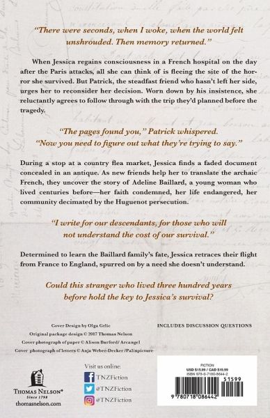 Award-winning author Mich¿¿le Phoenix weaves an unforgettable tale of hope and survival in The Space Between Words. In this split-time "powerful and compelling novel" (Library Journal starred review), one woman recovers from a traumatic event by uncovering secrets from the past. "There were seconds, when I woke, when the world felt unshrouded. Then memory returned." When Jessica regains consciousness in a French hospital on the day after the Paris attacks, all she can think of is fleeing the site of the horror she survived. But Patrick, the steadfast friend who hasn't left her side, urges her to reconsider. Worn down by his loving insistence, she agrees to follow through with the trip they'd planned before the tragedy. "The pages found you," Patrick whispered. "Now you need to figure out what they're trying to say." During a stop at a country flea market, Jessica finds a faded document concealed in an antique. As new friends help her to translate the archaic French, they uncover the story of Adeline Baillard, a young woman who lived centuries before--her faith condemned, her life endangered, her community decimated by the Huguenot persecution. "I write for our descendants, for those who will not understand the cost of our survival." Determined to learn the Baillard family's fate, Jessica retraces their flight from France to England, spurred on by a need she doesn't understand. Could this stranger who lived three hundred years before hold the key to Jessica's survival? Discover the enchanting and powerful journey of hope and survival in Mich¿¿le Phoenix's The Space Between Words. This unforgettable novel will reinforce your faith, evoke deep emotions, and offer a fresh perspective on history and the resilience of the human spirit. Pick up The Space Between Words today and experience the journey that will stay with you long after you turn the last page.